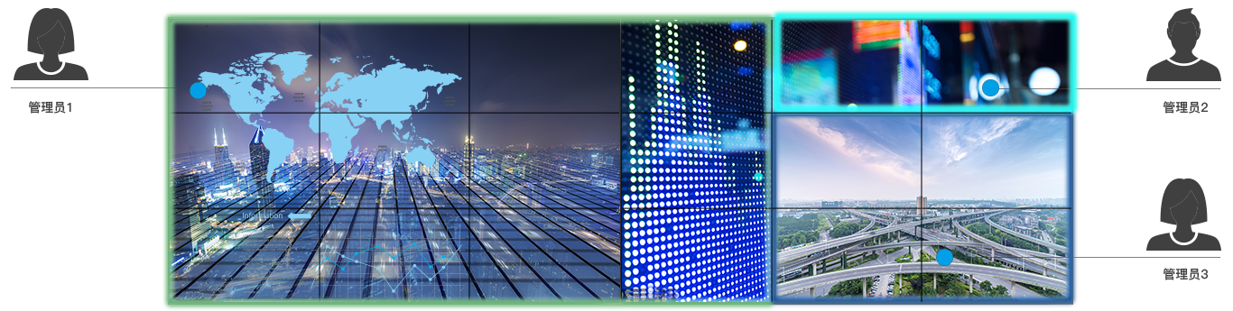 支持多人分權限管理,可指定人員管控特定信號源或大屏幕區域,多人之間操控實時同步。
