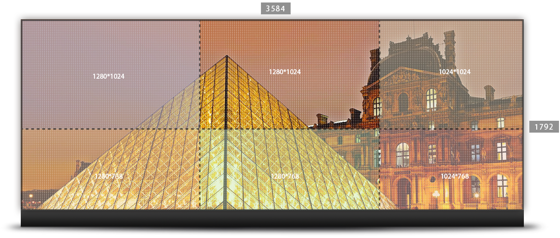 支持不同大小LED 模組的拼接顯示,LED 拼接器的每個輸出接口可支持8個圖層的顯示,可滿足不同現(xiàn)場的非常規(guī)拼接及顯示需求。
